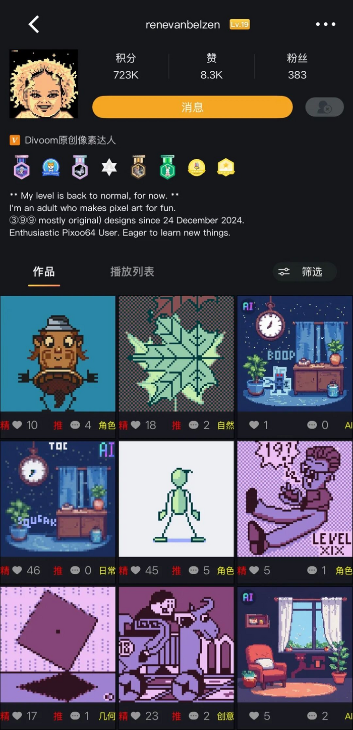 2015年,点音正式上线了APP,从一开始只具备绘画的功能性软件逐渐升级为像素圈一个举足轻重的创作者社区。现在的APP就像一个像素主题的社交软件,不光可以发布自己的作品,还可以在广场浏览别人的创作,点赞、关注、保存,甚至直接编辑。有些创作者会在主页很用心地编辑一长段简介,包括国籍、年龄、爱好、社交账号等等。
