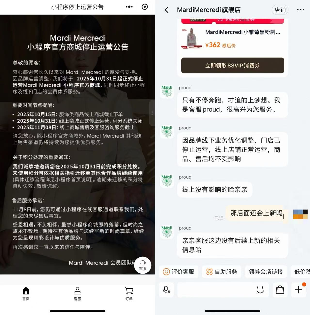 1. 品牌门店全停:Mardi Mercredi已关闭所有线下门店,品牌小程序官方商城自10月31日起停运,会员服务终止,但天猫旗舰店仍正常运营,商品和售后不受影响。