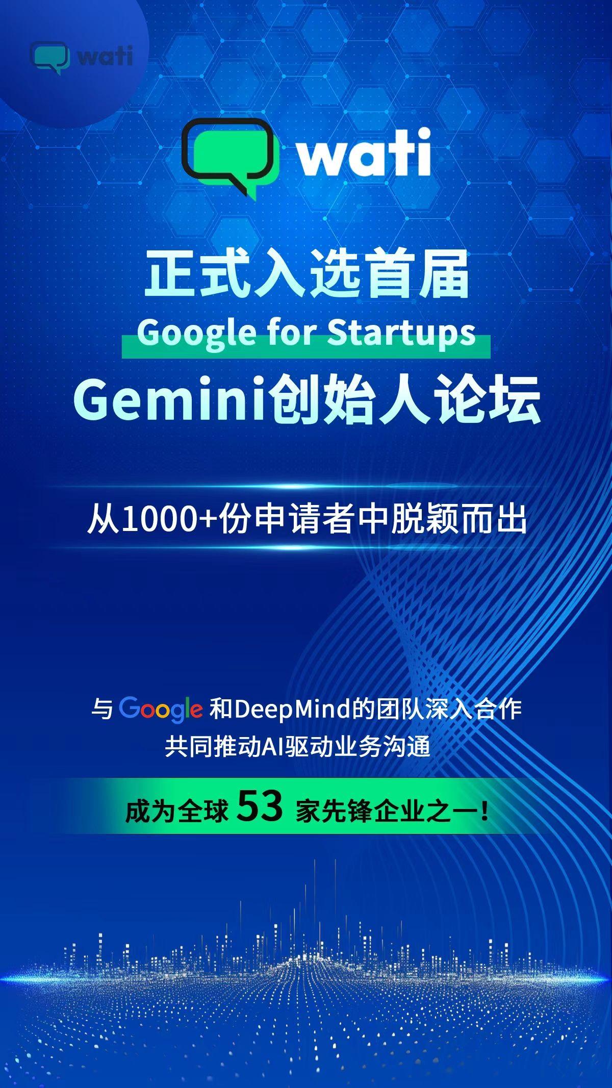 1. Wati 从全球近 1000 份申请中脱颖而出,成为首届 Google for Startups Gemini 创始人论坛全球仅有的 53 家先锋企业之一,彰显其在 AI 领域的领先地位。