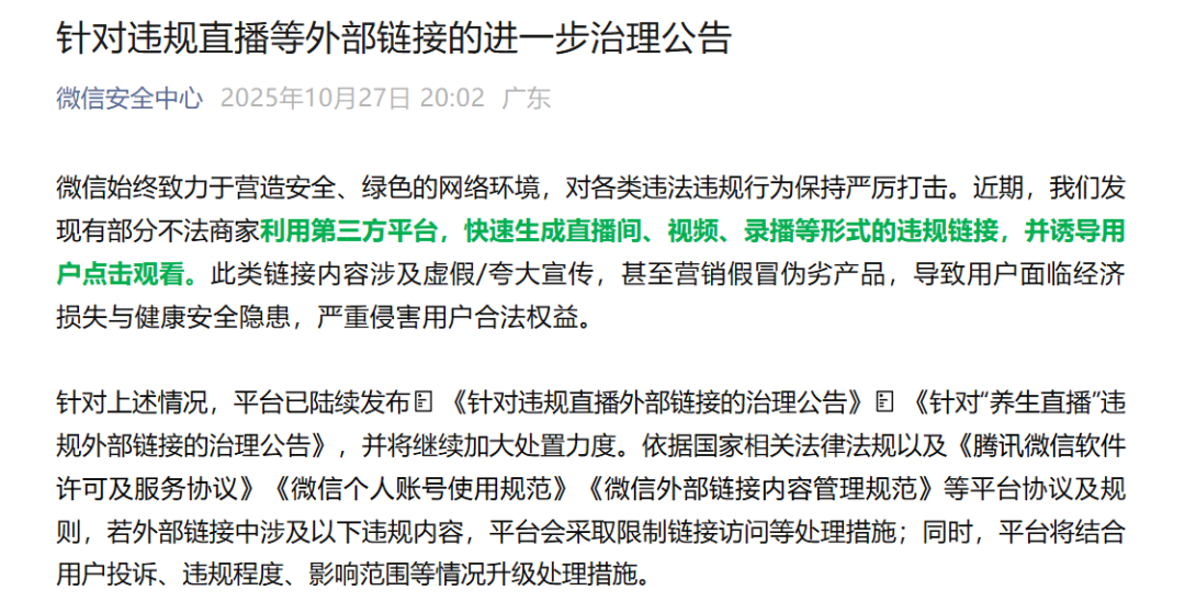 如果说前两次只是针对H5外链传播的违规,那么10月这次治理范围扩大至第三方直播工具与云协作平台,覆盖更广泛的传播链路,从“管控内容”蔓延至“管控传播路径”。有商家称,这次是“至今为止最严厉的一次治理”。
