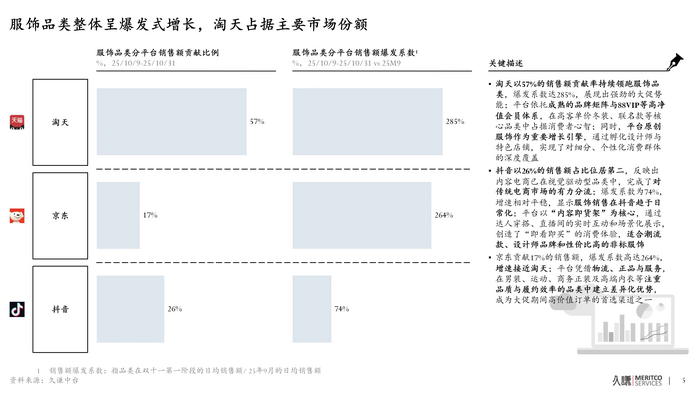 1.市场份额:淘宝天猫服饰成交占全网57.5%,排名第一,领先京东的17%和抖音的26%,显示出天猫的绝对优势。