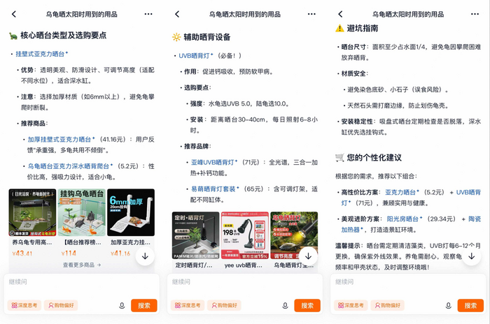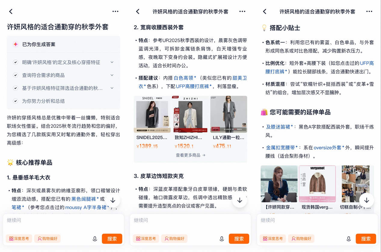 1. “AI万能搜”已处理近5000万个消费需求,聚焦宠物和母婴话题,宠物问题讨论量比母婴高出82%,还为用户提供明星同款商品推荐及服饰搭配建议。