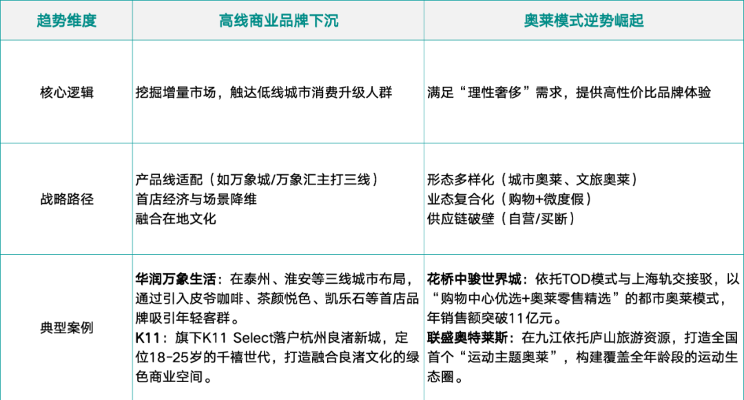 消费市场的二元分化在2025年愈发明显。一方面,一线城市和新一线城市市场趋于饱和,竞争白热化;另一方面,低线城市(三四线城市)的消费升级需求正在释放。对应的高线商业品牌如万象城、K11、香港置地系商业等品牌下沉二三线市场,同时奥莱商业也在快速崛起。