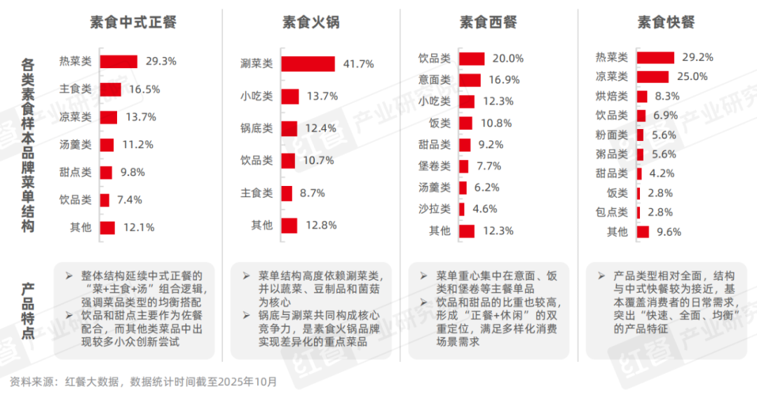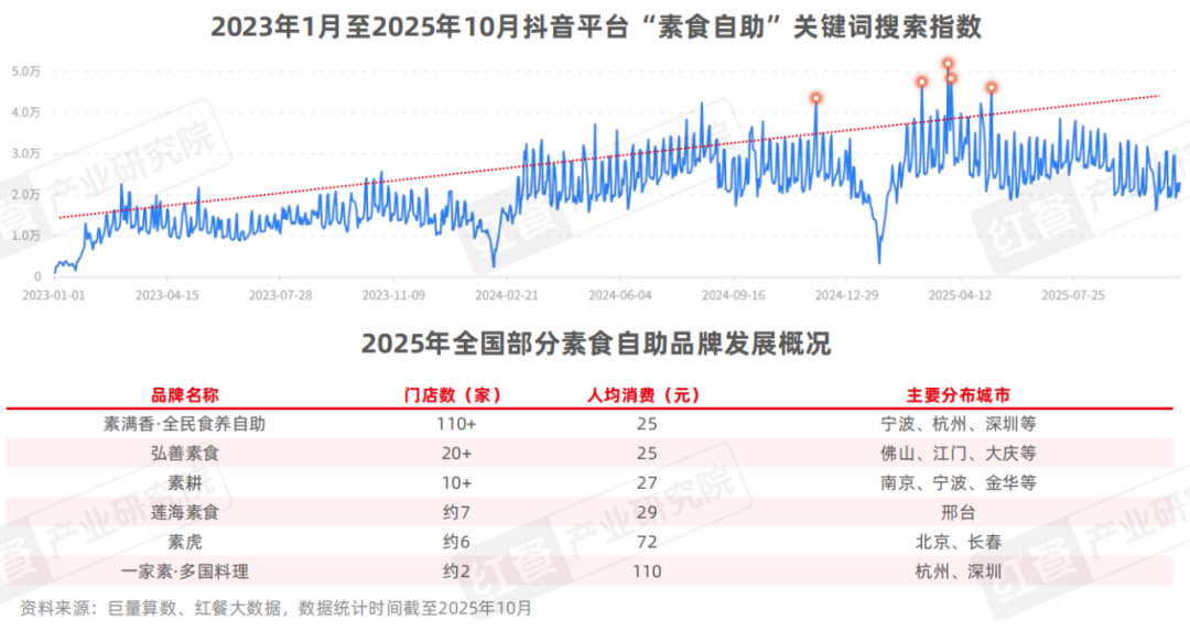 3. 新派素食品牌兴起,如素满香(超110家门店)、素耕等,定位健康生活;自助模式流行,抖音搜索热度上升。