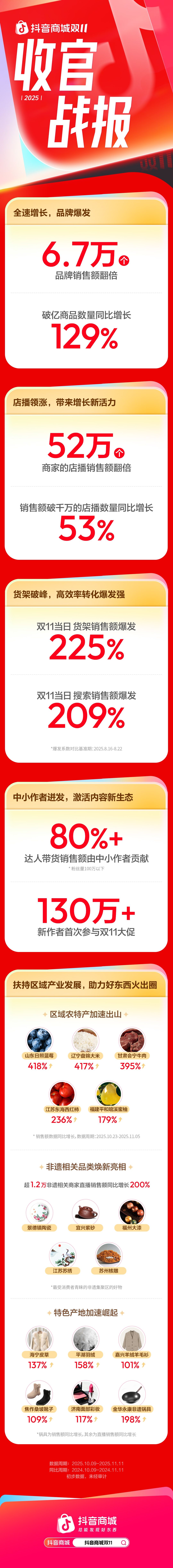 · 在这个让品牌充分掌握经营主动权的生态场域,6.7万个品牌销售额在抖音电商实现翻倍增长,销售额破亿的商品数量同比增长129%。