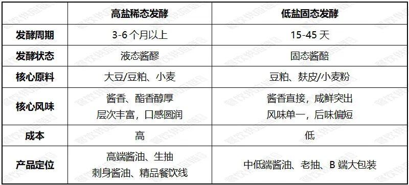 常见的酱油发酵方式有两种:高盐稀态发酵和低盐固态发酵。两种发酵方式制作的酱油有何不同?可以直观看看下表。
