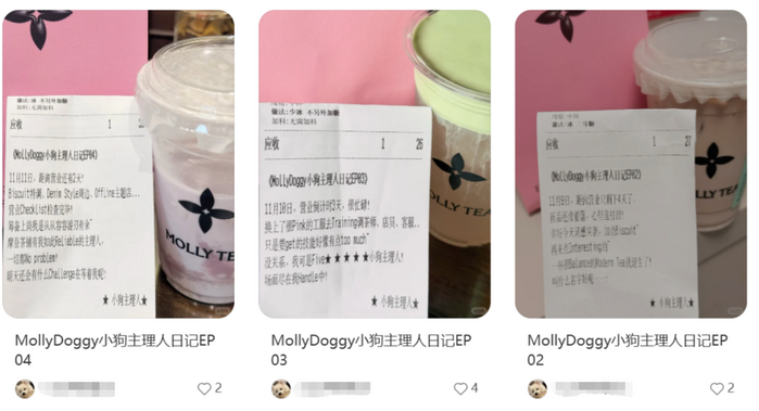 1.品牌营销方面,联名以IP形象与场景深度结合,通过“小狗主理人”人设赋予IP新职业角色,强化定制化情感连接;营销预热用小票连载构建“陪伴式”上新事件,提升社交互动性和共鸣力。