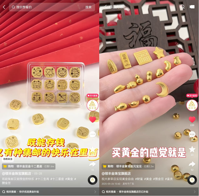 1.产品生产需求上,领丰金案例展示小克重产品(如1克金豆)降低消费门槛,结合差异化套组(星座系列)激发复购,提示工厂应关注用户实际痛点设计灵活货盘。