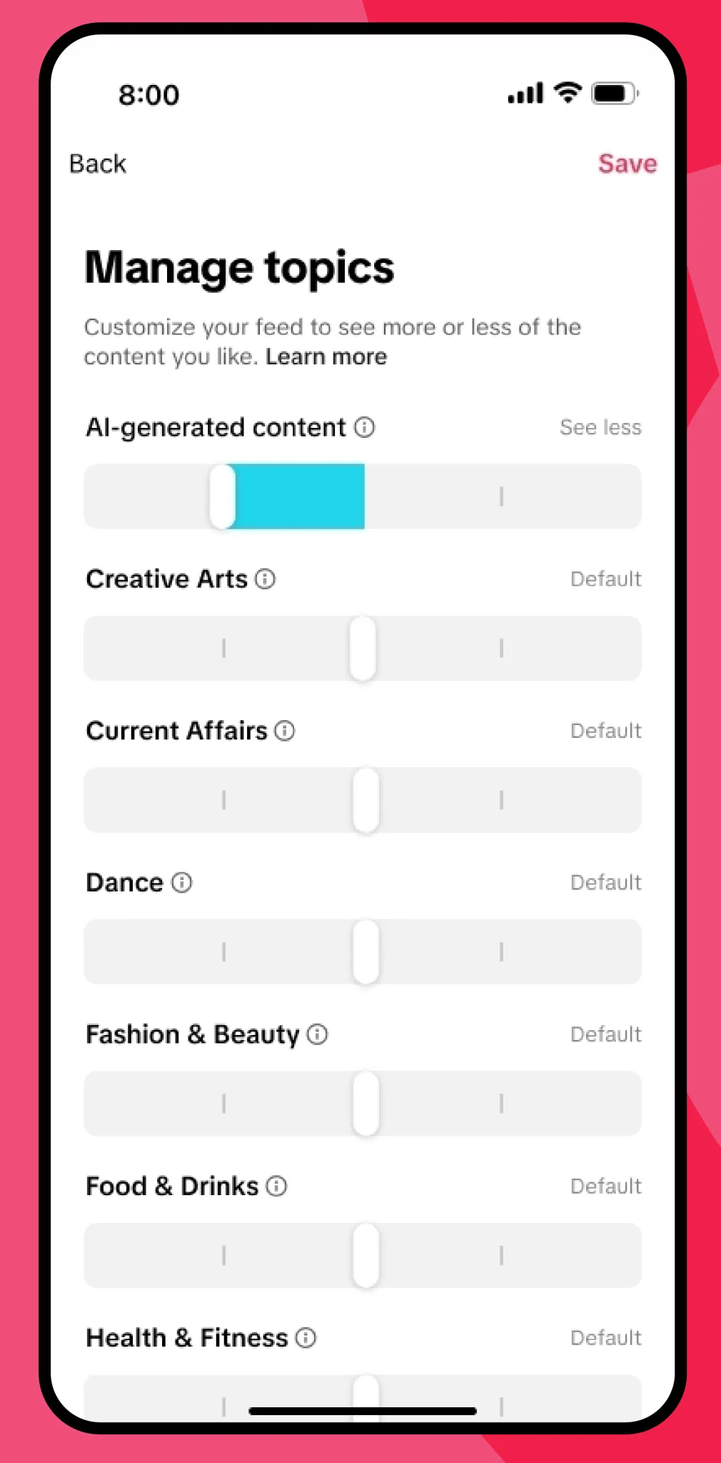 1. 用户可在设置的话题管理中通过滑动条调整For You推荐流中的AI生成内容比例,类似控制舞蹈或美食类内容的方式,新功能将在未来几周上线。