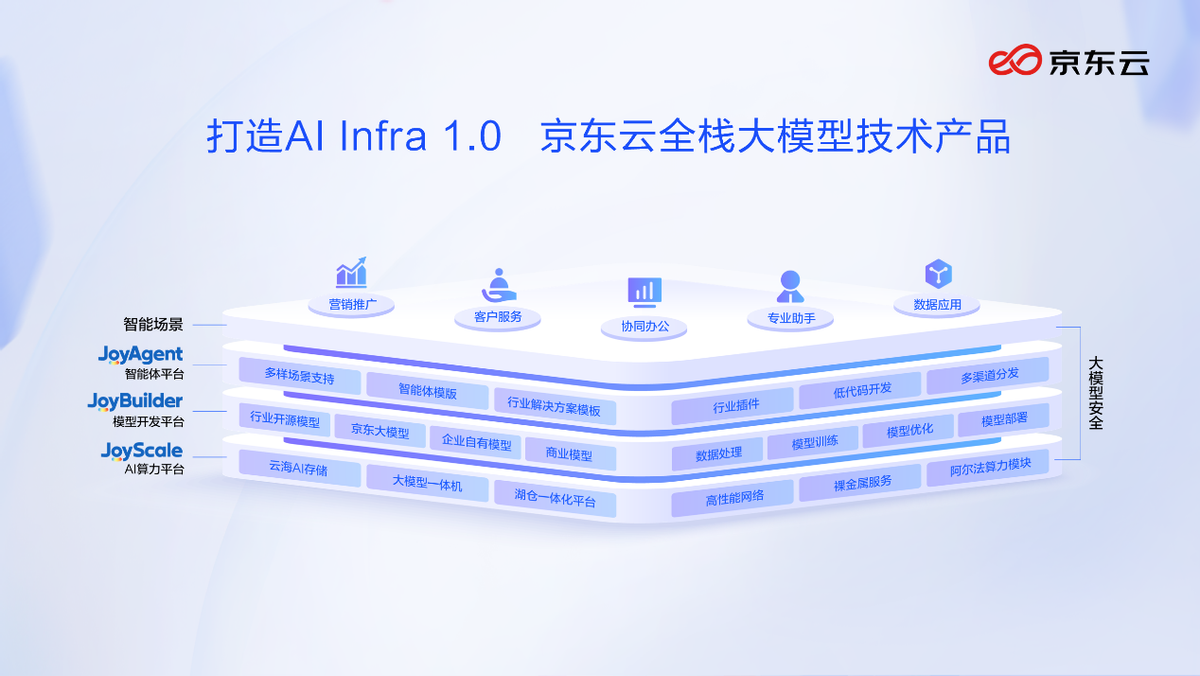 2.AI基础设施升级为JoyScale AI算力平台和JoyBuilder模型训推平台,平台支持混合计算调度英伟达及国产芯片,模型训练与推理效率提升400%,成本降低80%,还提供安全可信数据空间确保合规。