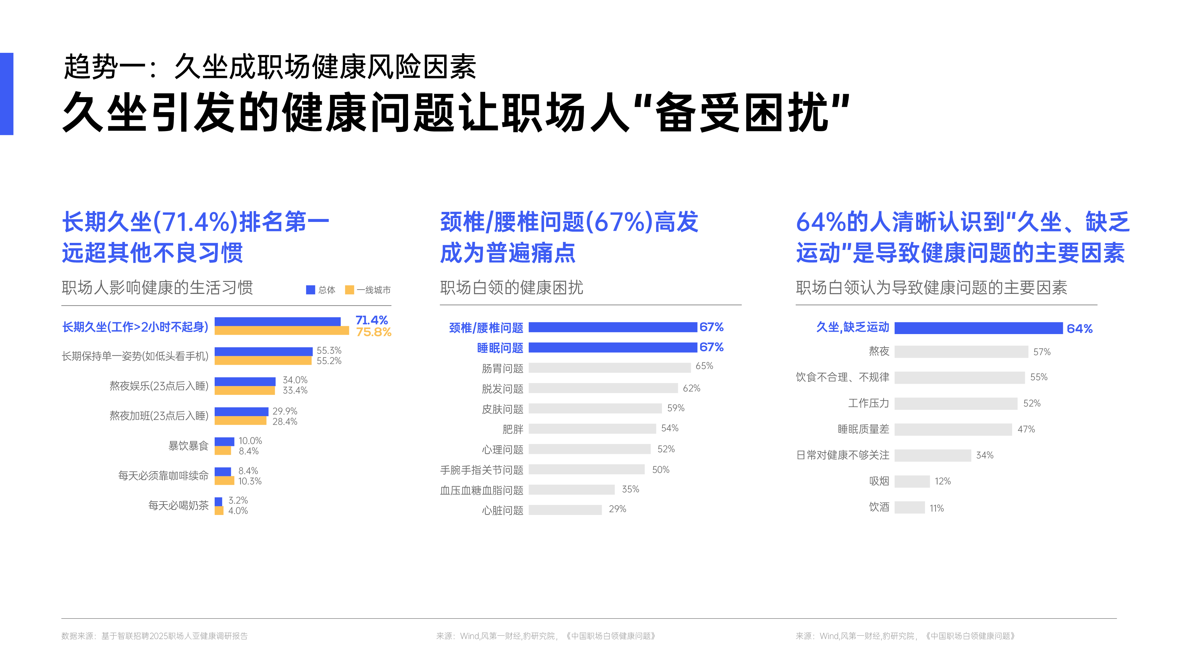 1. 数据显示长期久坐是最大健康隐患,占比71.4%,远超熬夜和暴饮暴食,并导致超六成职场人出现颈椎或腰椎问题,程序员等高强度职业日均久坐超8小时。
