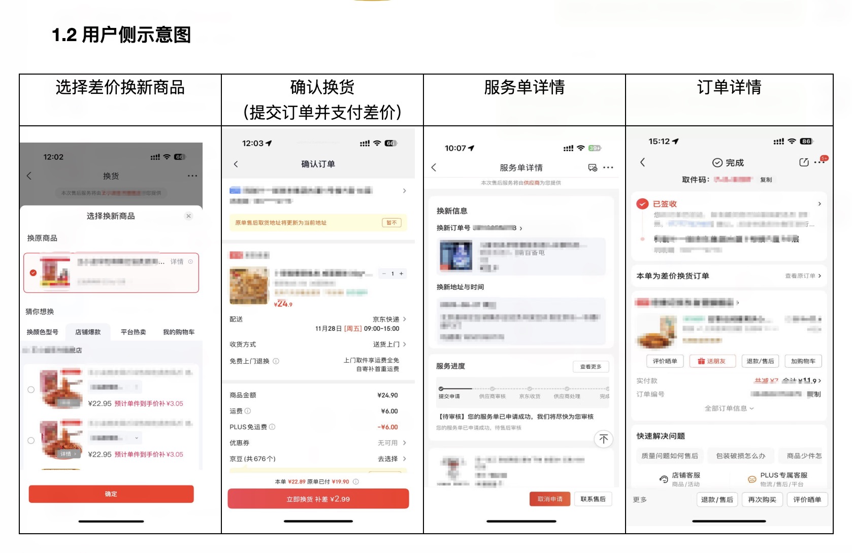 2. 换货商品范围覆盖平台可售商品,按同spu商品、同店铺商品、平台推荐商品、购物车商品展示;用户支付差价后可在App查看新订单进度。