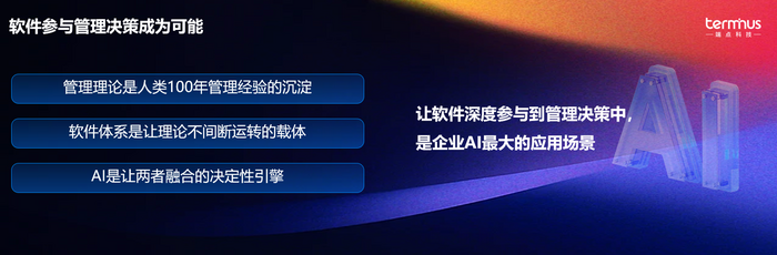 赵沣伟表示,AI参与企业管理决策,体现在理论、软件、Agent三要素的结合。让软件深度参与到管理决策中,是企业AI关键的应用场景。