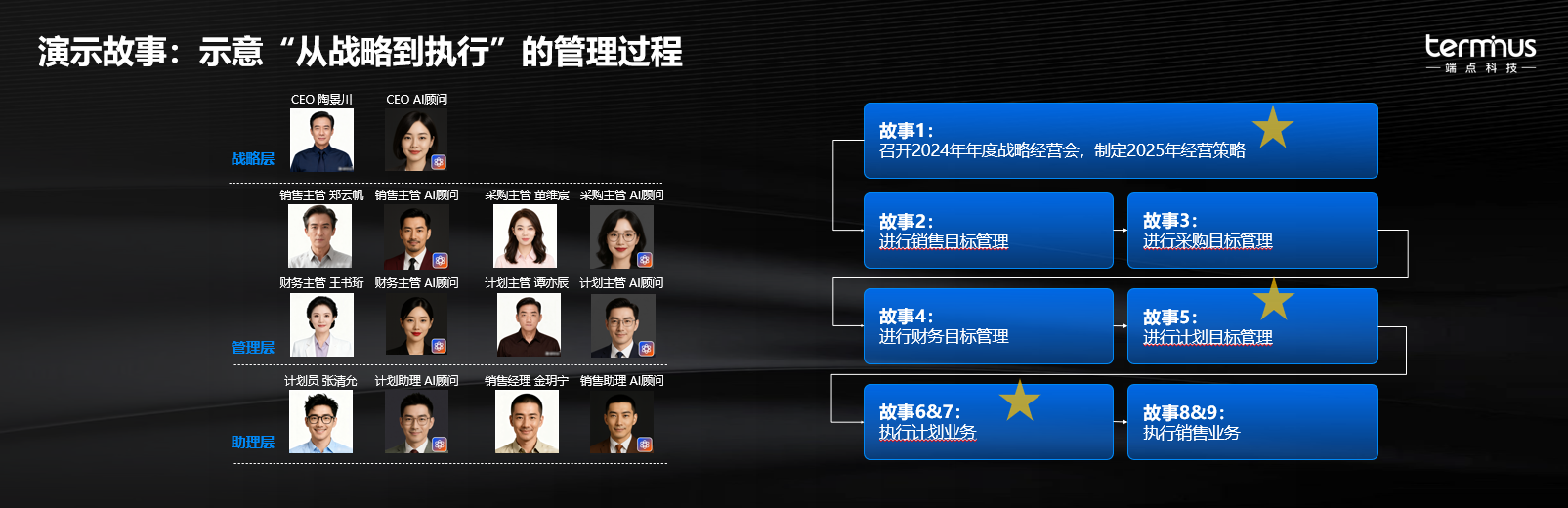 每个角色有两个头像,白底头像为人类员工,黑底头像代表的是其对应的AI管理顾问。右侧展示的则是完整的业务故事线,从年度战略经营会开始,涵盖销售、采购、财务等环节。