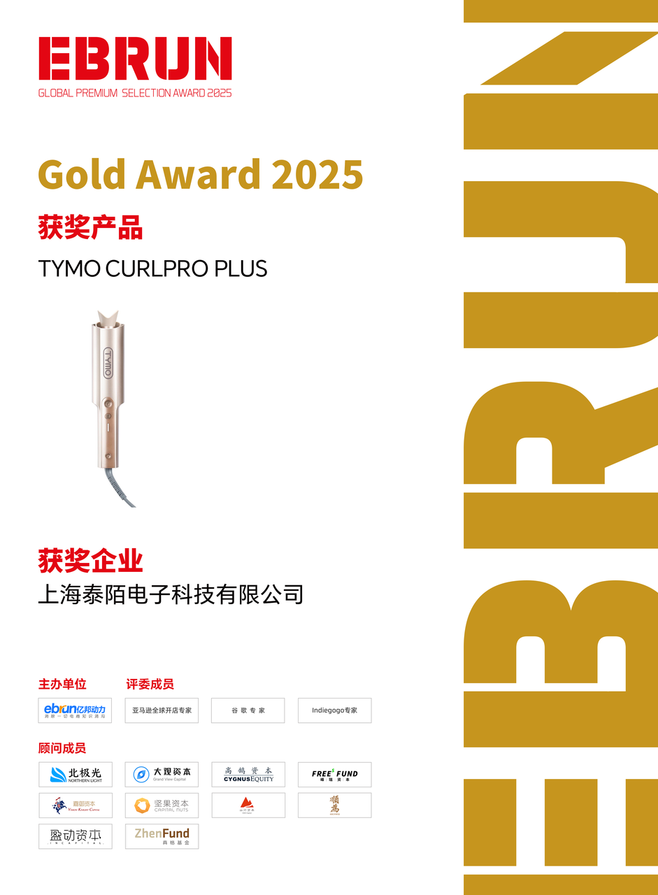 TYMO泰陌荣获2025 EBRUN全球好物Gold Award大奖,其CURLPRO PLUS全自动卷发棒提供高效易用的美发解决方案。