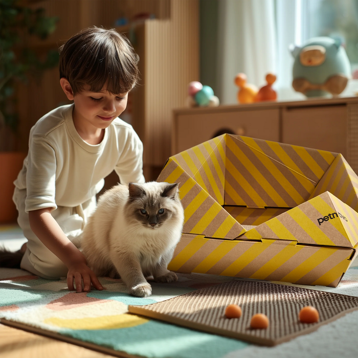 1.产品使用FSC认证可追溯纸材,从源头降低森林压力,废弃后可完全回收,助力可持续生活。2.设计采用“折纸×山形”几何结构,减少胶钉和五金使用,便于高效运输和收纳,节省空间。3.窝内集成高密度蜂窝抓板,四面围合设计满足猫咪磨爪休憩需求,有效保护家中家具,解决养宠痛点。