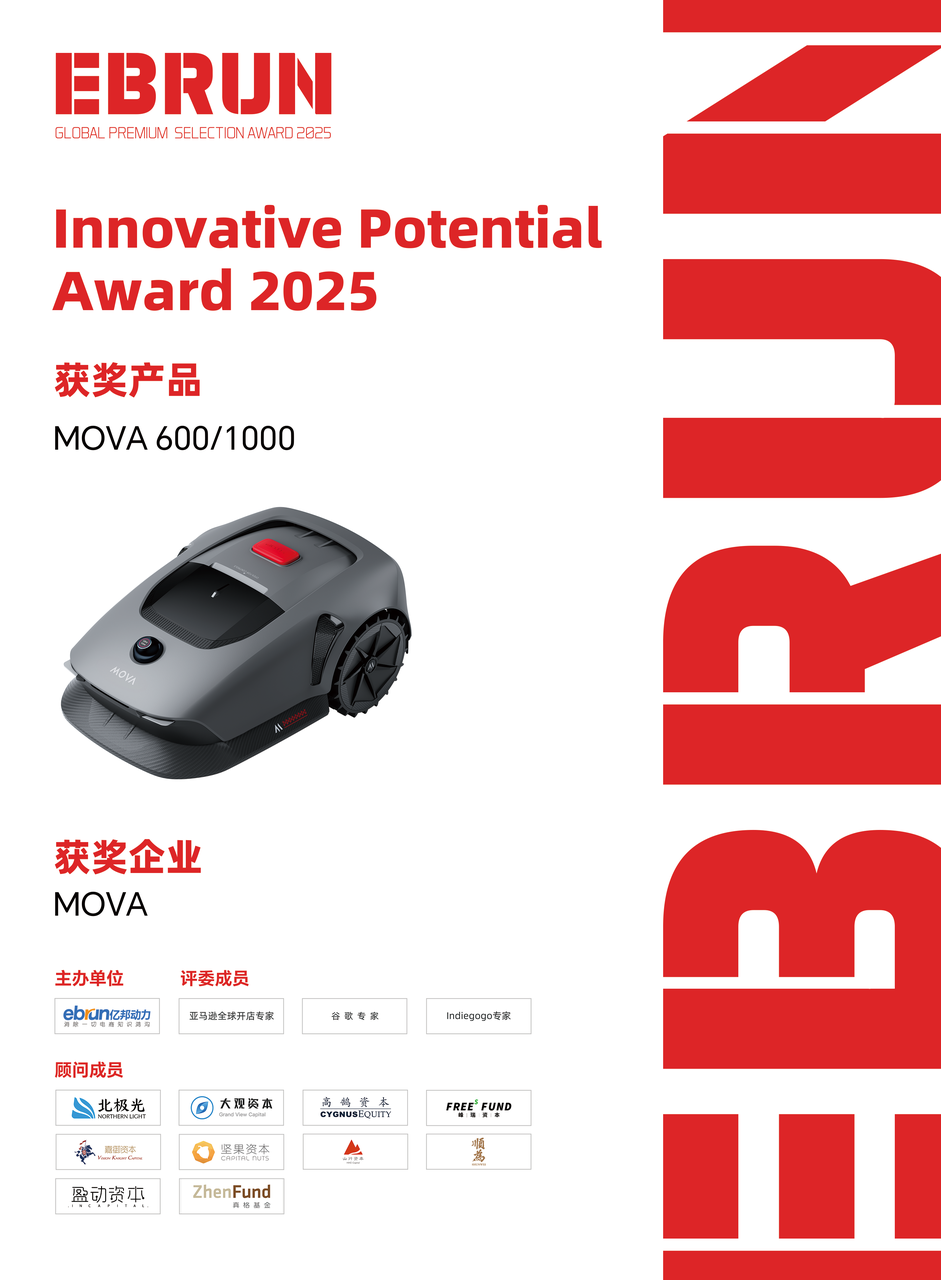 MOVA智能割草机器人荣获EBRUN全球好物奖,提供高效实用的庭院维护解决方案。