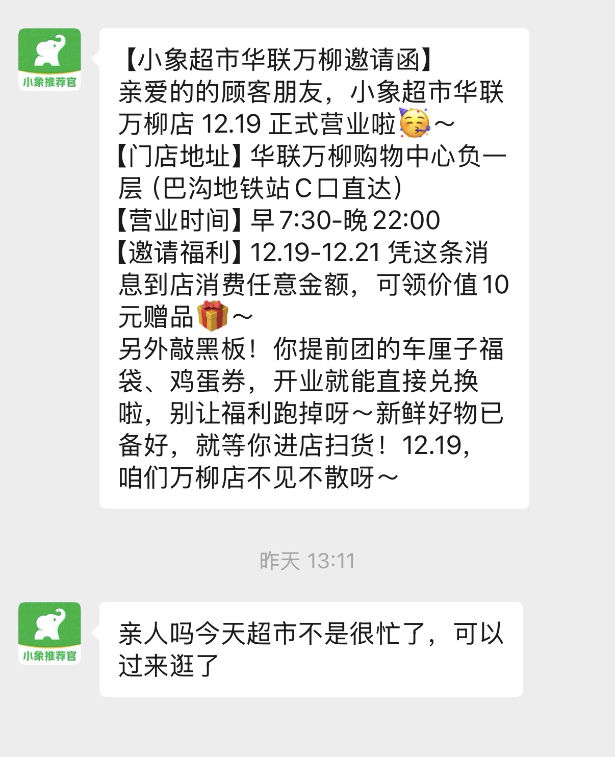 开业后的第四天,也就是12月23日,我收到了小象超市地推人员群发的消息:“亲人们,今天超市不是很忙了,可以过来逛了……”