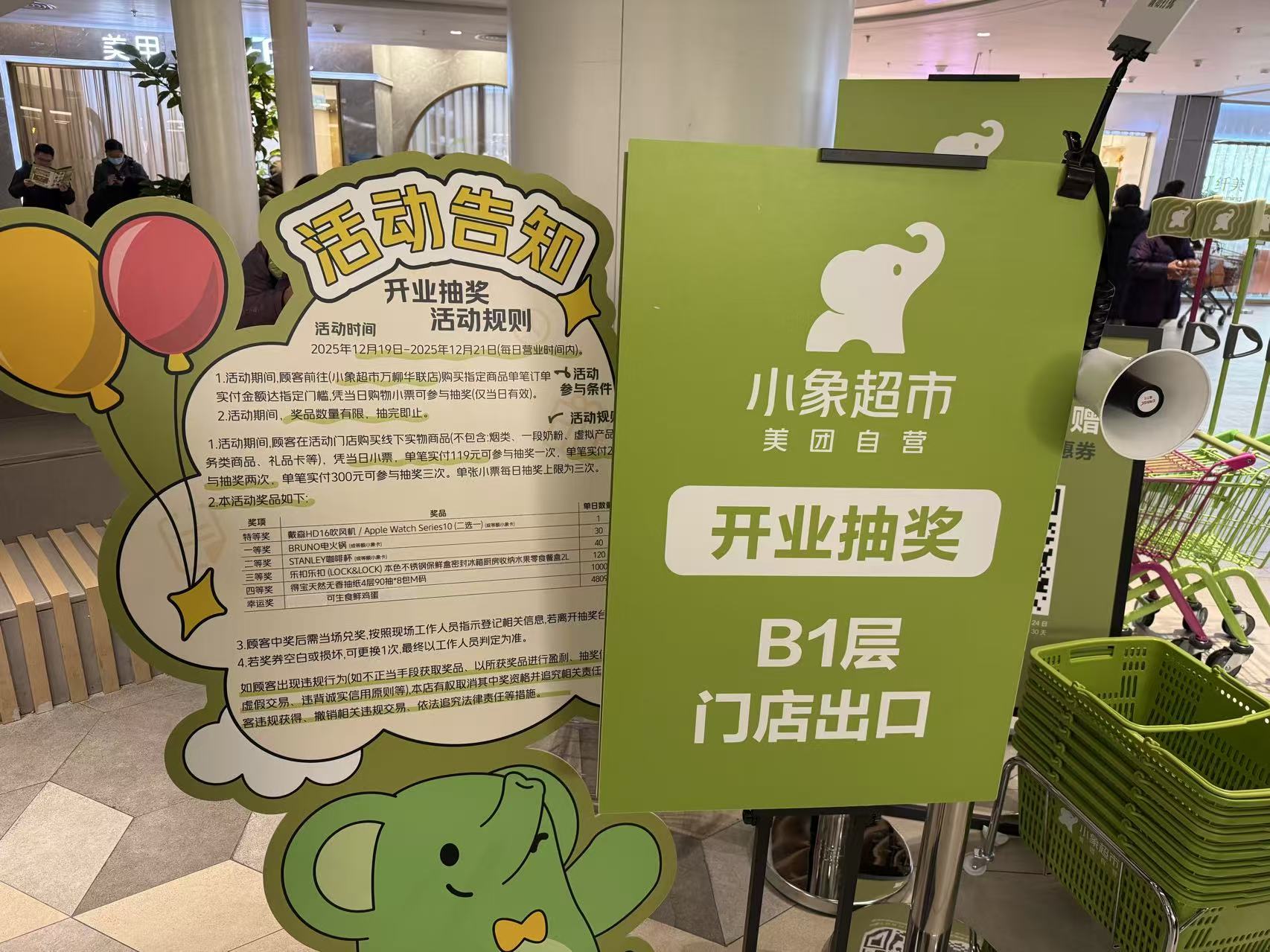 为了吸引消费者,小象超市推出一系列开业福利,包括满119元抽大奖、90-15满赠优惠券、限定福袋、会员免费领冰淇淋和停车等等。
