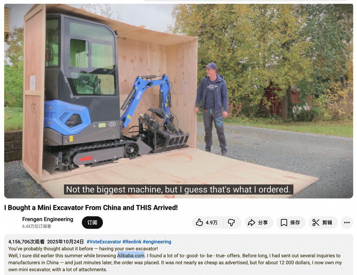 1. 重点事件:海外博主Frengen Engineering在阿里国际站发现仅2000美元的小型挖掘机,以为是玩具,但开箱后震撼于高质量、高性能,视频获415万观看,引发新词“阿里巴巴挖掘机”流行。