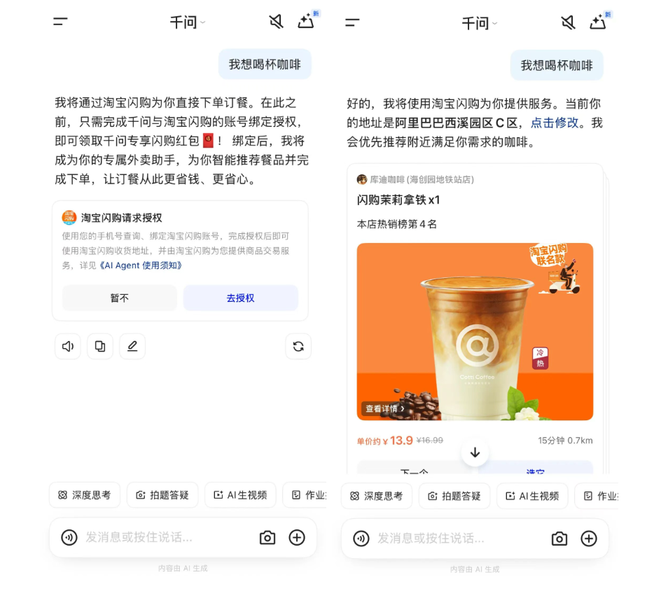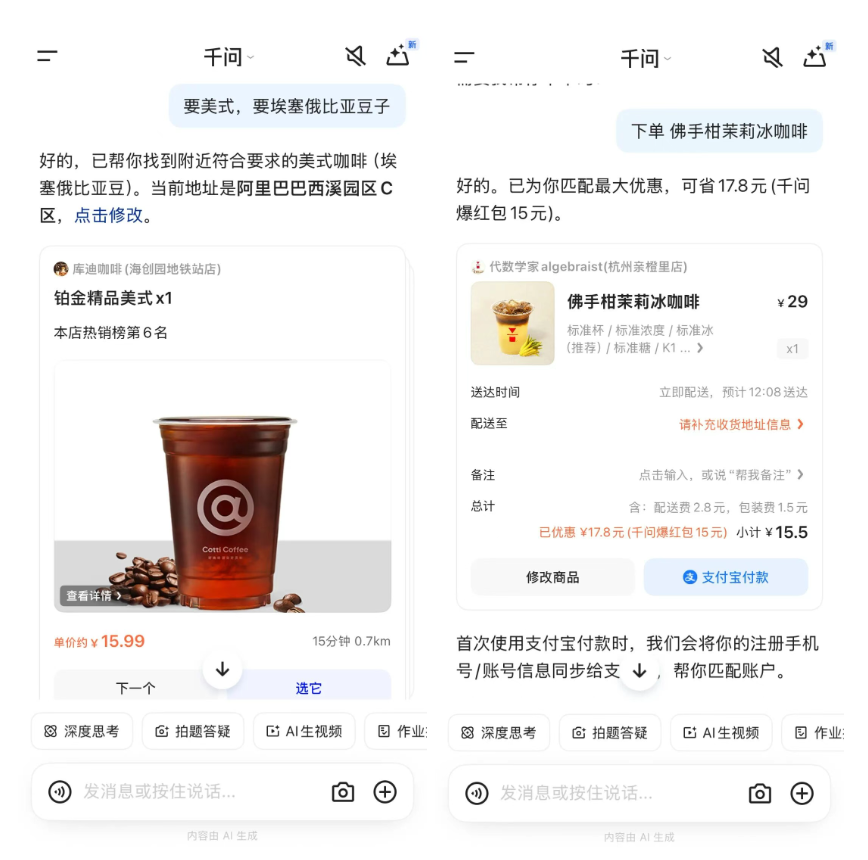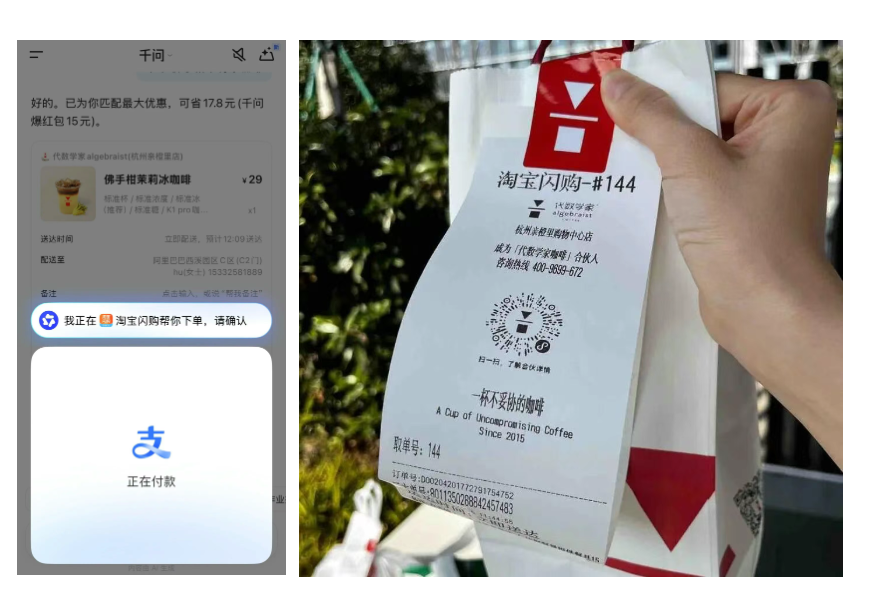 阿里千问C端事业群总裁吴嘉介绍,千问是能办事的AI,通过“Qwen最强模型”与“阿里最丰富生态”的结合,在生活中实实在在地替用户“干活”。点咖啡背后,是千问与淘宝闪购、支付宝原生AI支付能力“AI付”的系统级打通。