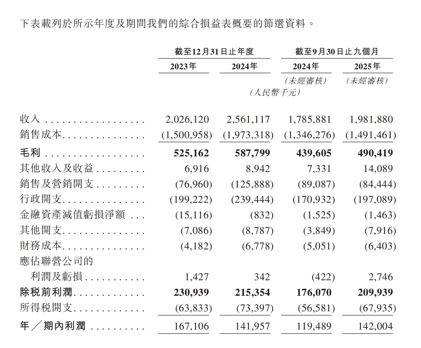 1.财务表现:2024年全年收入25.61亿元,同比增长26.4%;2025年前九个月收入19.82亿元,同比增长11.0%;毛利率24.7%,经调整净利润同比增长18.8%。