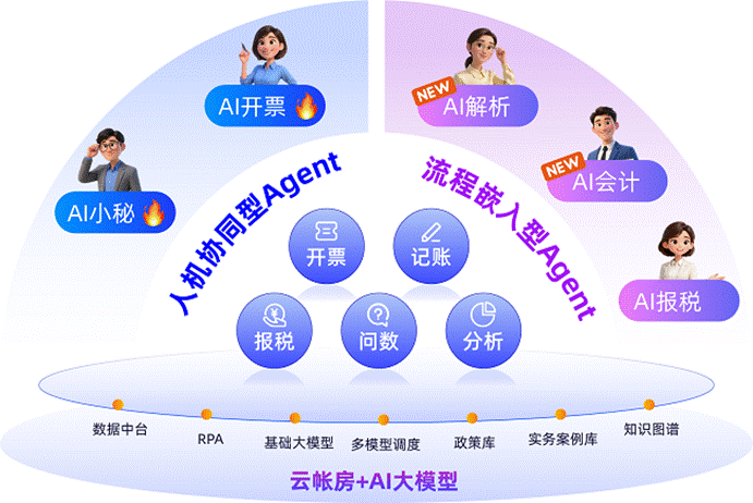 1. 公司作为AI原生企业,基于10余年财税大数据和AI大模型,开发了涵盖票、财、税业务的AI数智员工Agent综合体。