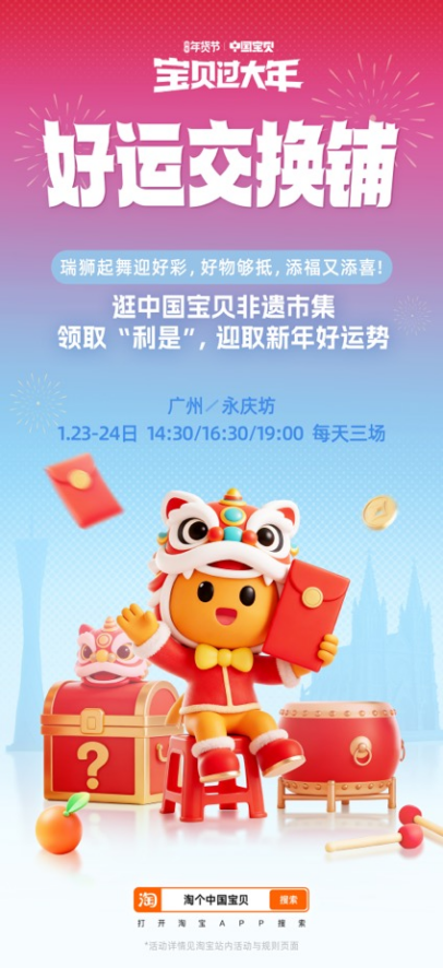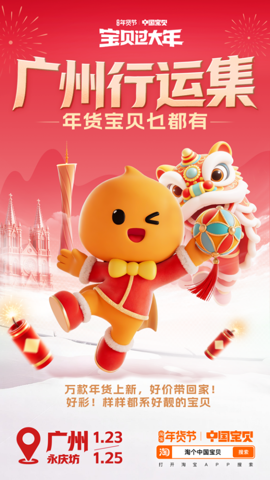 淘宝年货节在广州永庆坊举办,提供丰富活动和福利,让游客轻松参与年味体验。
