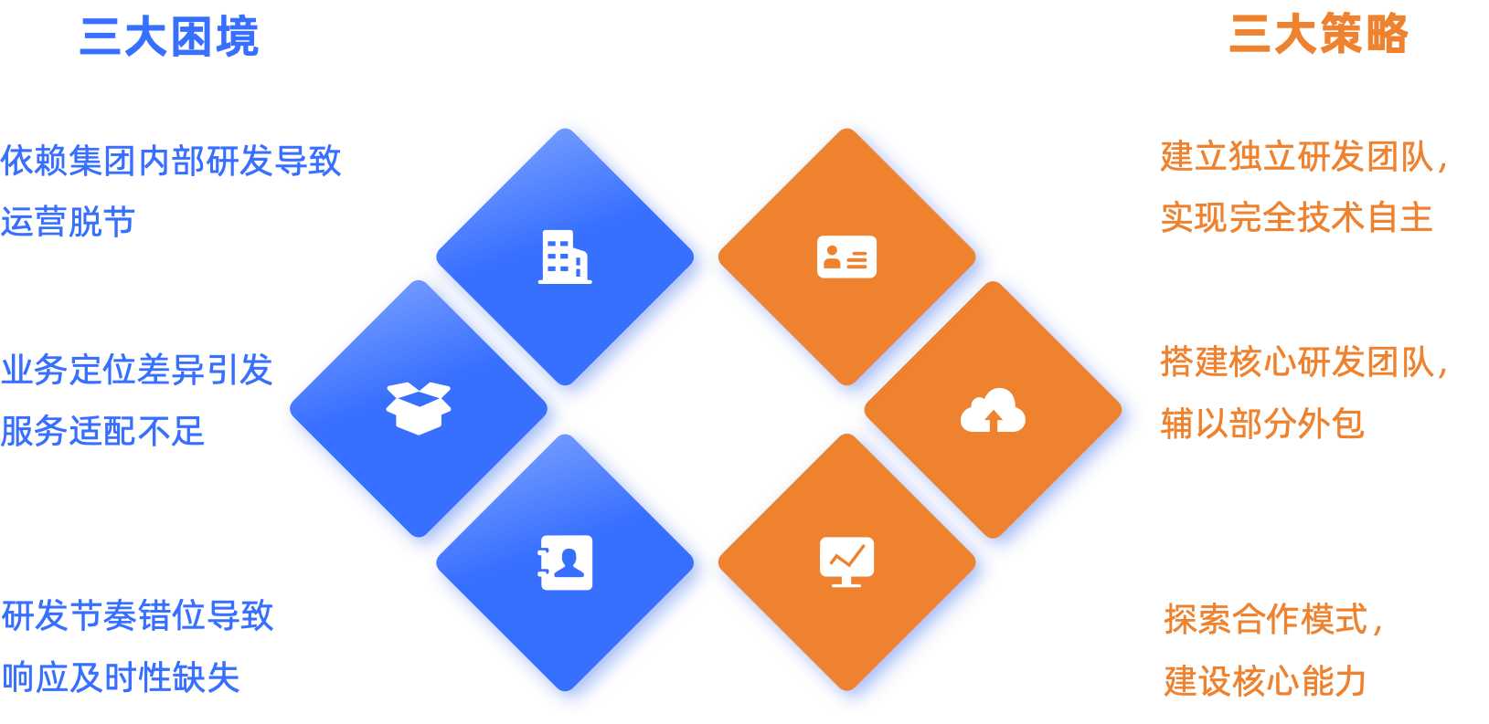 2.应对策略有建立独立研发团队实现完全技术自主,采用“内部整合+外部引进”人才组建方式,争取集团资源授权;搭建核心研发团队辅以部分外包,明确自主与外包边界,聚焦需求对接、核心功能研发和外包管理;探索合作模式如市场交易和收益绑定合作分成,规避人天核算弊端。