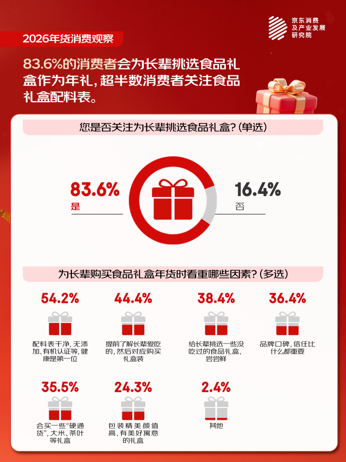 1. 消费趋势:春节送礼转向“长辈真实需求”,77.2%选择营养保健品,83.6%选食品礼盒,健康回归成主流,如54.2%关注配料干净。