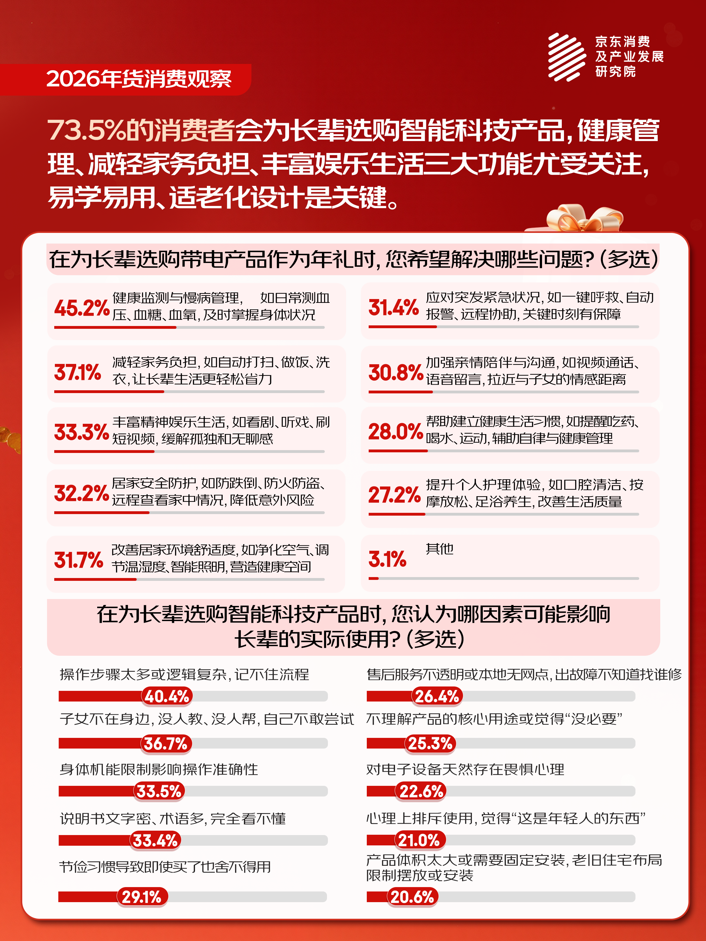 3. 风险提示:智能设备痛点突出,40.4%担忧操作复杂,36.7%因无人教学可能退货;选礼需避免束之高阁,42.4%强调实用性。
