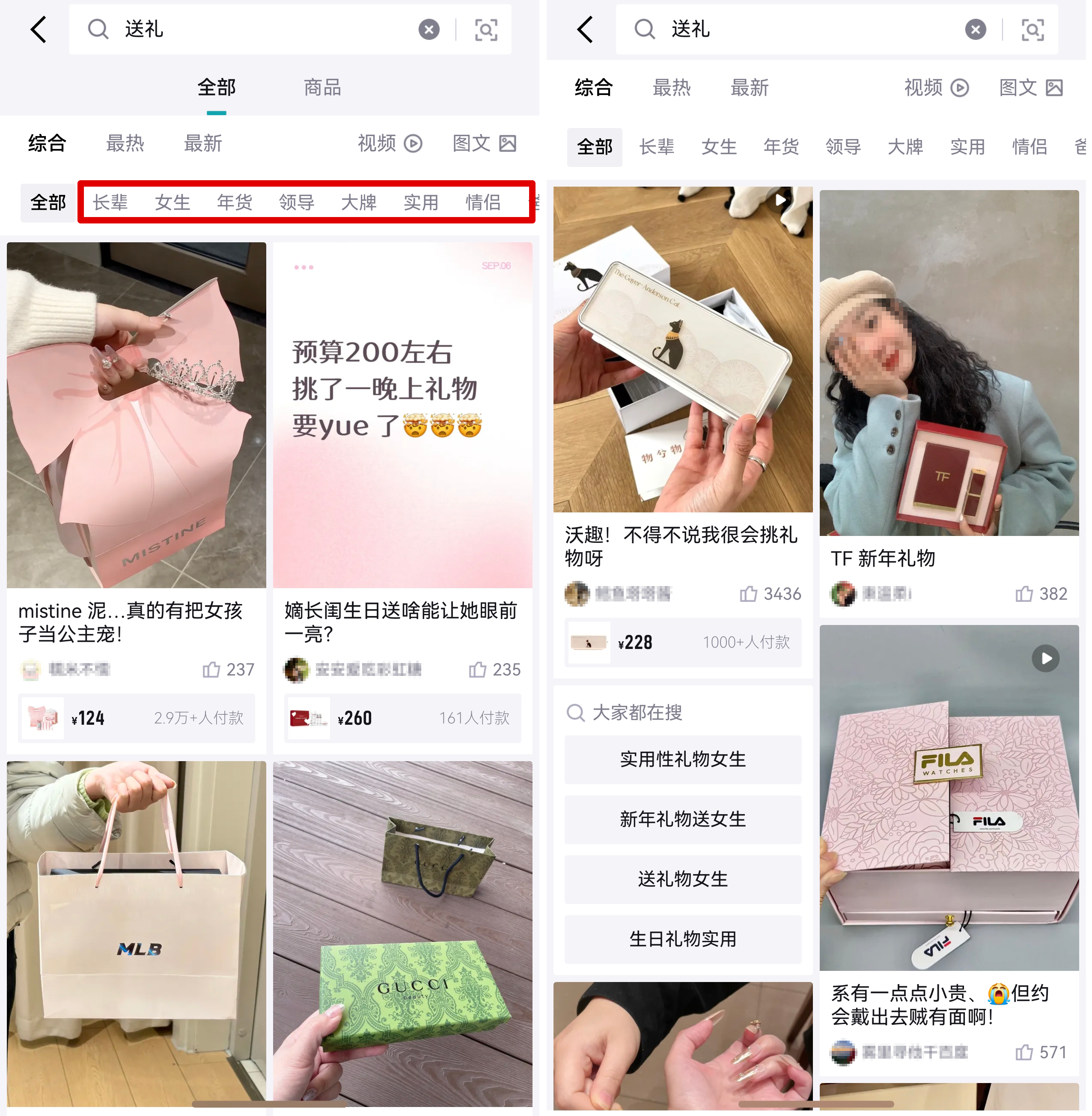 在得物App上,平台对送礼需求的满足是偏“内容化”的。搜索“送礼”,搜索结果既有商品链接,更多的还是送礼的经验贴、礼品开箱测评等,顶部还有“长辈”、“女生”、“大牌”、“白酒”、“手链”、“玩偶”等筛选标签。