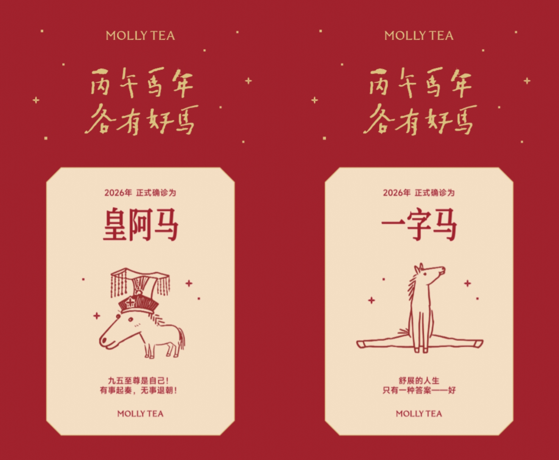 2. 互动玩法: 小票渠道有“新年各有好马”人设互动,包括20种脑洞大开的马年人设如“皇阿马”;首次推出DIY“欢喜贴贴”杯贴,鼓励用户自创专属人设,增强参与感。