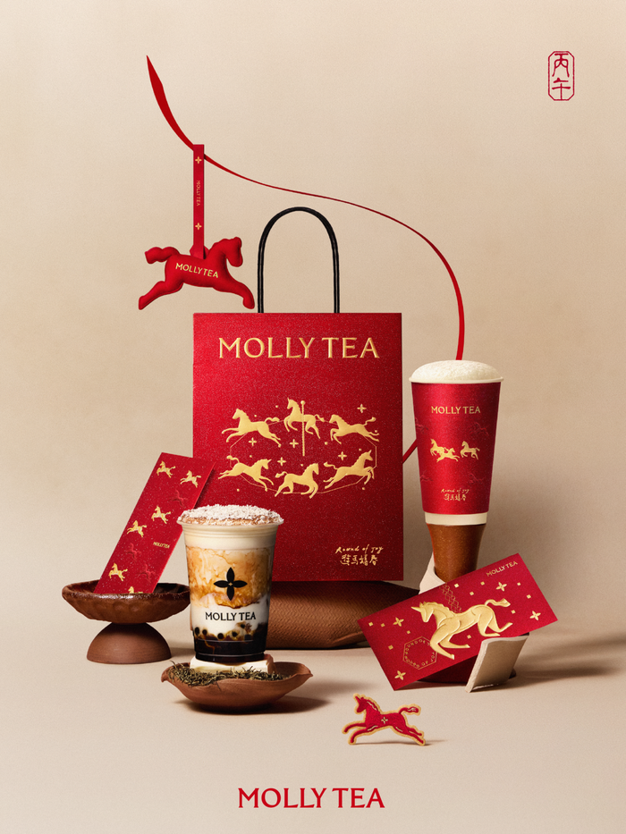 1. 设计亮点: 延续中国红底色和生肖主题,今年以旋转木马呈现“游马嬉春”概念,使用闪闪杯材质,传递轻松玩乐氛围。