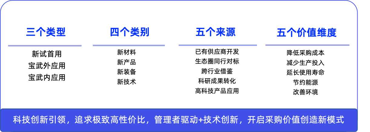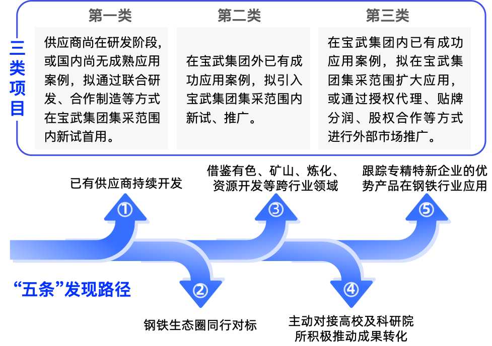 集团层面率先制定《关于建立首台(套)装备、首批次材料、首版次工业软件采购绿色通道的实施意见》,在内部建立制度保障。以此为基础,宝武欧贝平台的核心功能从交易拓展至协同创新,通过梳理“四个类别、五个来源”的需求,以明确的采购订单和未来应用场景为牵引,直接驱动“四新”(新材料、新产品、新装备、新技术)项目研发。
