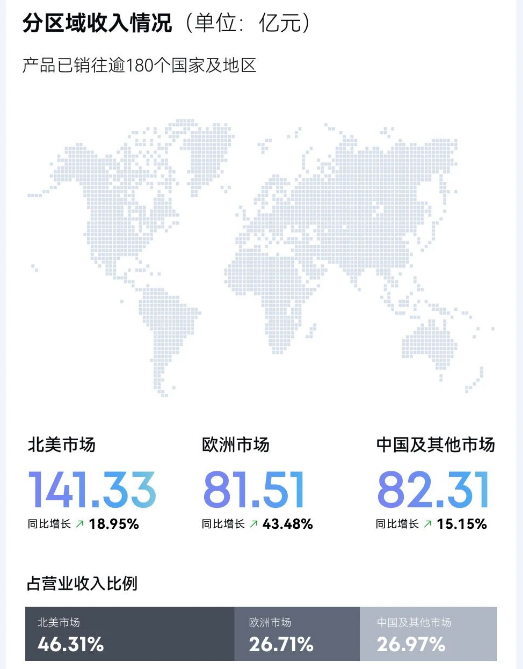 分区域来看,安克在北美市场的品牌影响力与市场份额保持领先,营收达141.33%亿元,同比增长18.95%,占营收比例46.31%,仍是绝对主力;在欧洲市场则受益于区域发展机遇实现快速增长,营收达81.51亿元,同比增长43.38%;在中国及其他市场,营收达82.31%,同比增长15.15%。