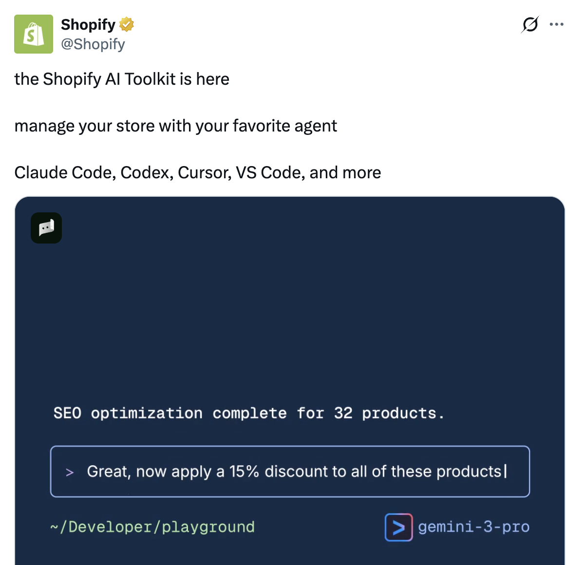 总:Shopify上线AI Toolkit,允许AI工具接入生态,跨境卖家可用自然语言指令让AI接管店铺运营工作。