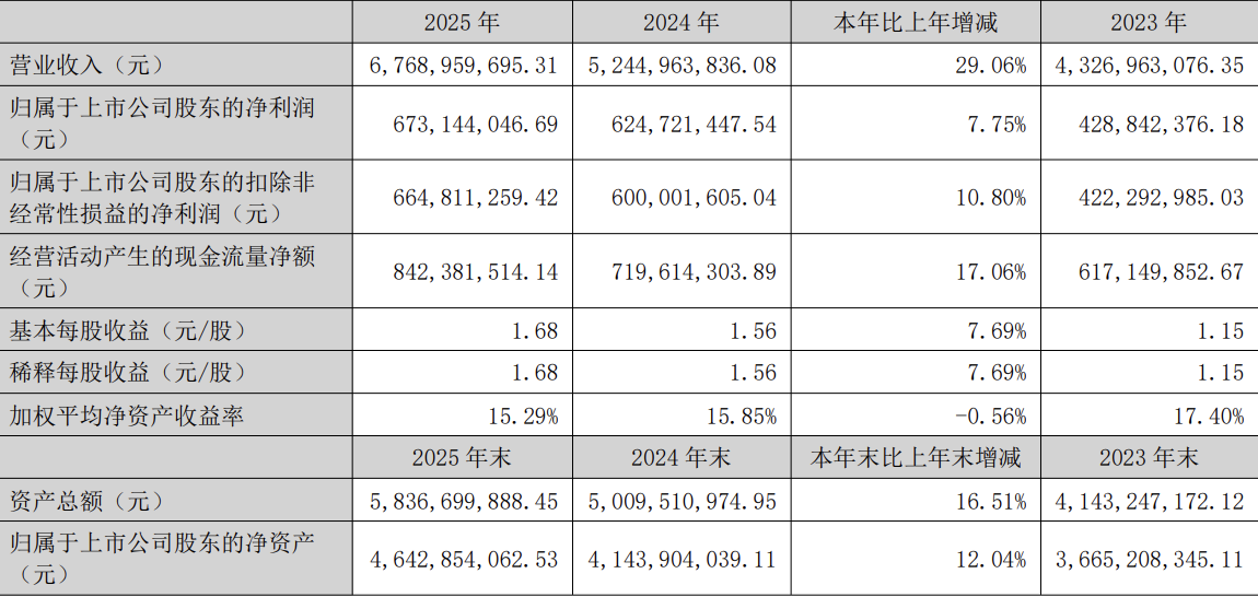 1.2025年营收67.69亿元,同比增长29.06%;归母净利润6.73亿元,同比增长7.75%。2026年一季度营收16.44亿元,同比增长11.08%;归母净利润1.24亿元,同比下降39.5%。