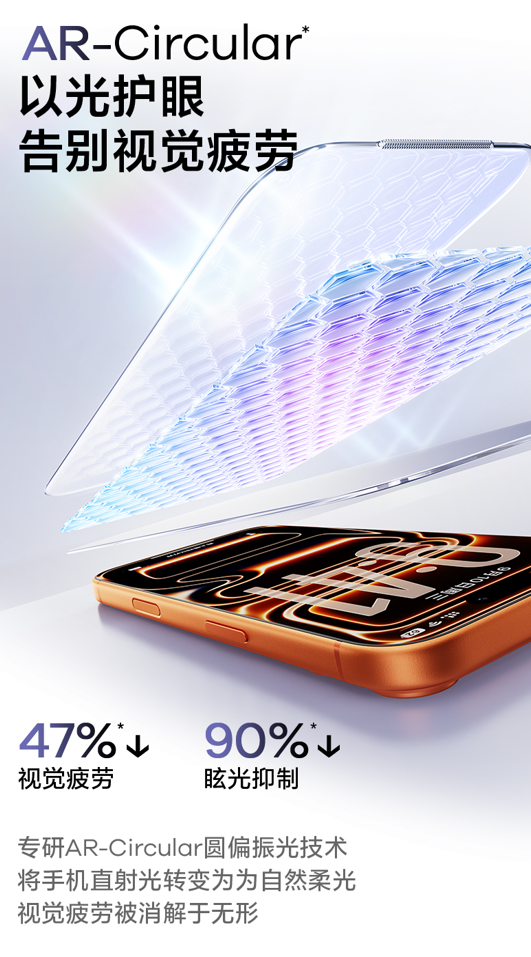 1. 视觉体验上,96%透光率和<0.7%反射率显著提升屏幕清晰度,并采用AR Circular圆偏振光技术减少视觉疲劳47%、抑制眩光90%,户外强光下也护眼不模糊。