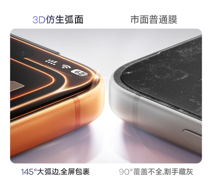 2. 形态贴合上,145°大弧边设计边缘误差<0.1mm,实现无缝包裹,手感顺滑且通过60cm防落球测试,增强防护性。
