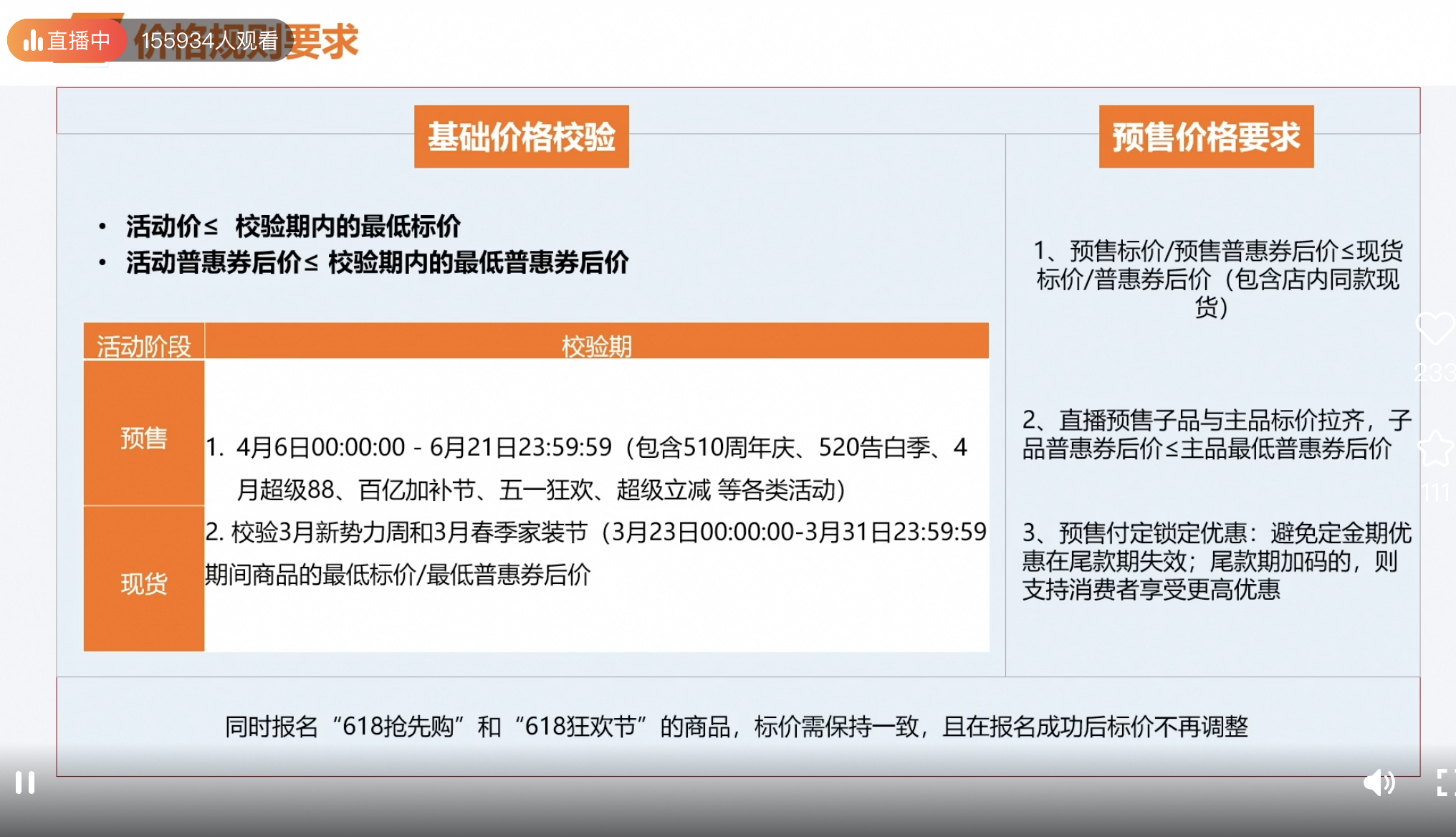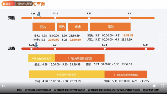 1.平台最新做法:实施预售和现货双阶段(预售5月21日-6月3日,现货分两波),官方立减让利比例统一设定(1%、5%、15%),商家承担成本。