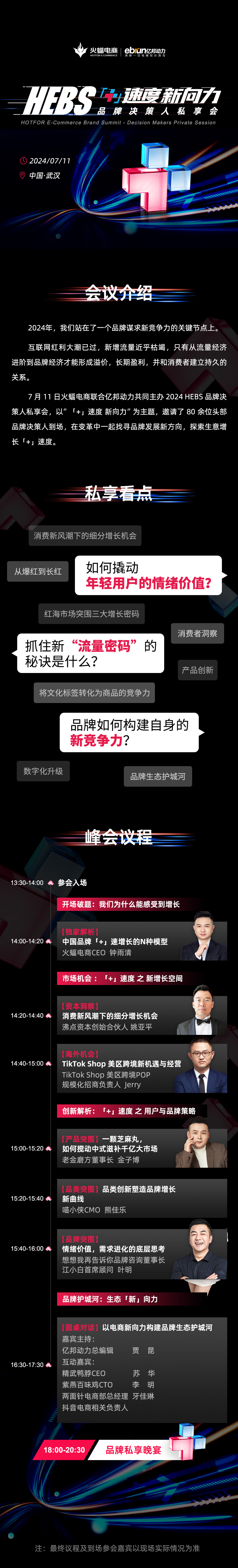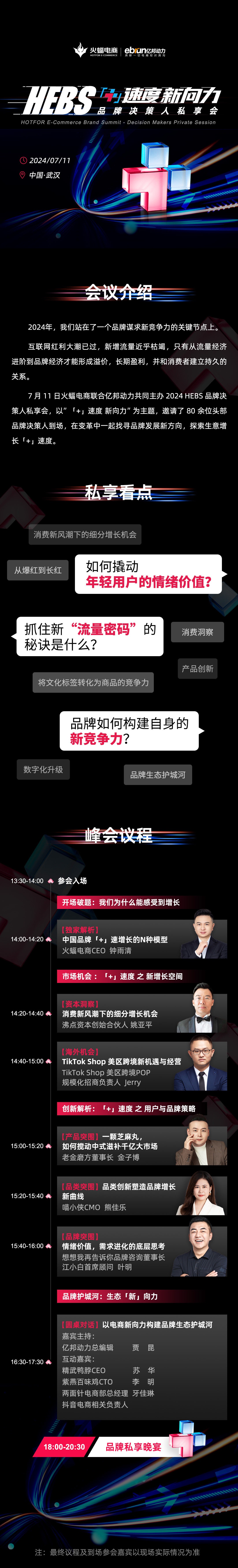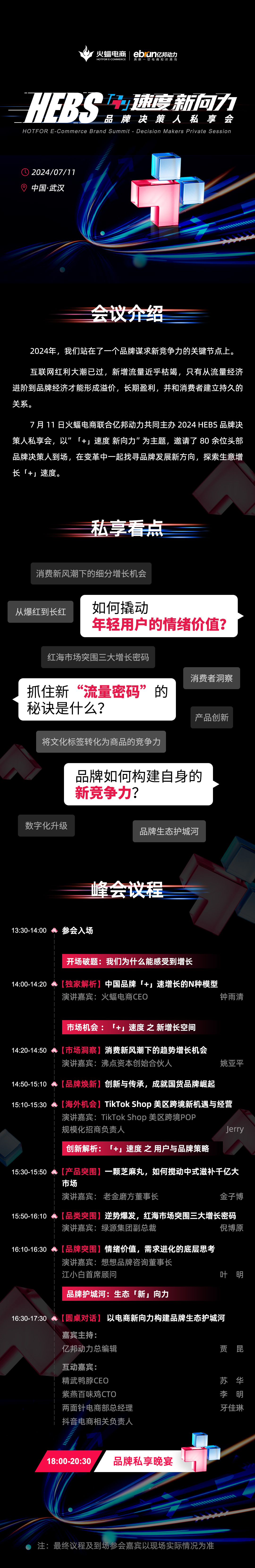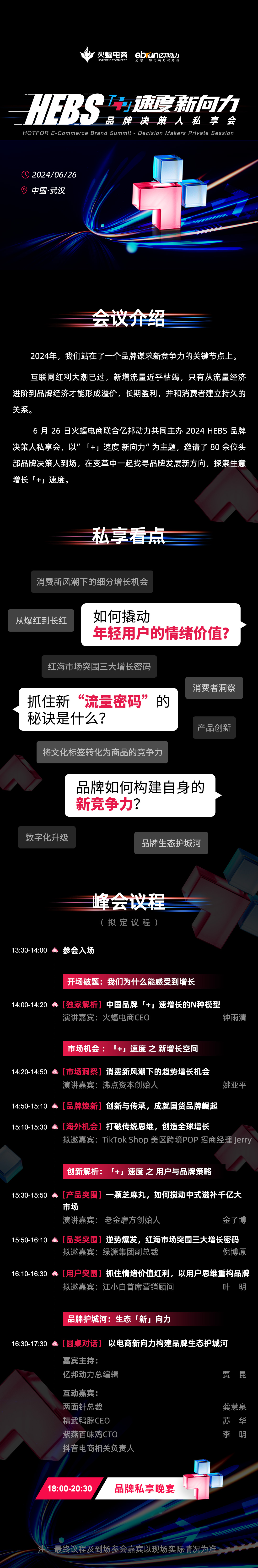 由火蝠电商及亿邦动力联合主办的 2024 HEBS 品牌决策人私享会,以”「+」速度 新向力”为主题,将于 7 月 11 日在武汉举办。我们邀请了 80余位头部品牌决策人到场,在变革中一起找寻品牌发展新方向,探索生意增长「+」速度,研讨品牌向上生长的力量。
