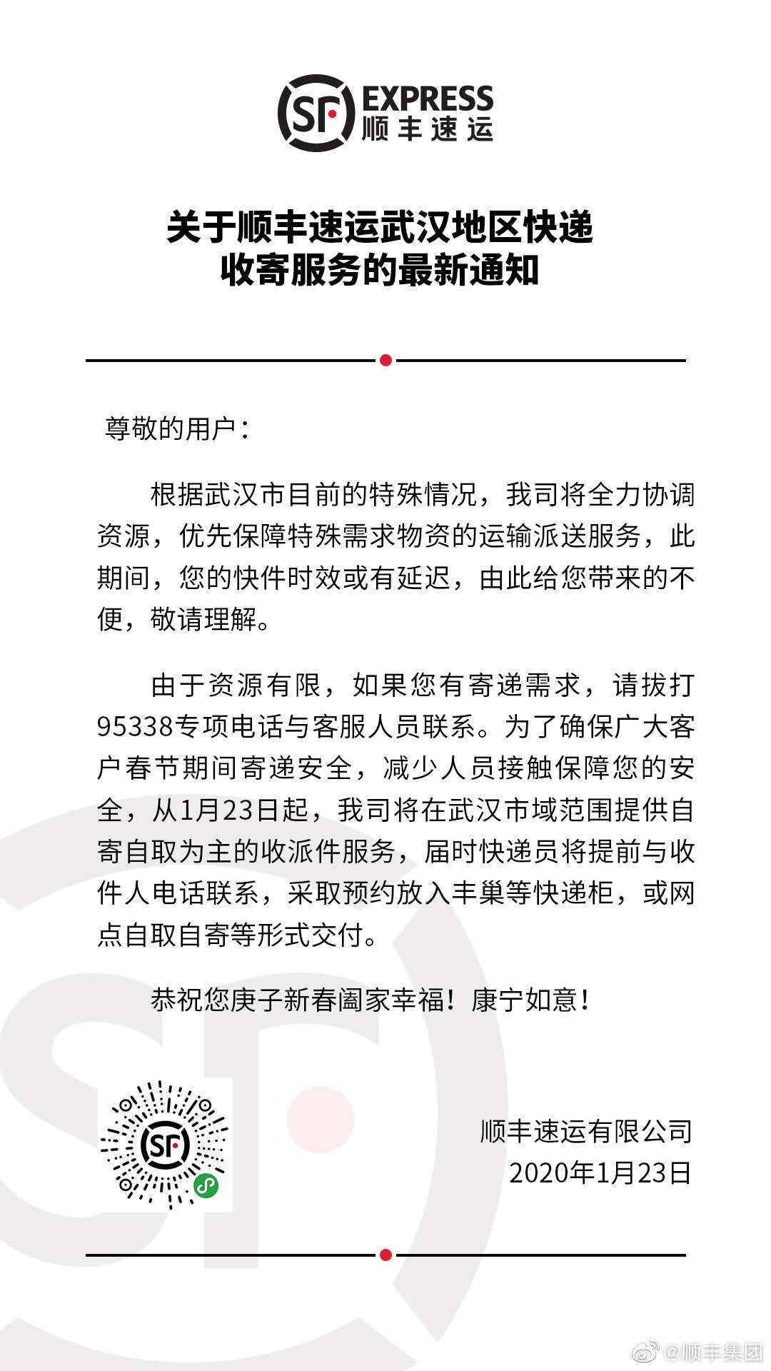 1月23日消息,顺丰速运发布武汉地区快递收寄服务最新通知,根据武汉市目前的特殊情况,顺丰速递将优先保障特殊需求物资的运输派送服务。此外,为确保客户春节期间寄递安全,从1月23日起,顺丰速递将在武汉市域范围提供自寄自取为主的收派件服务。