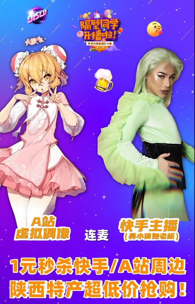 4月24日消息,晚8点,A站虚拟偶像连麦快手主播(聂小倩她老板),开启1元秒杀快手/A站周边 陕西特产超低价抢购活动。