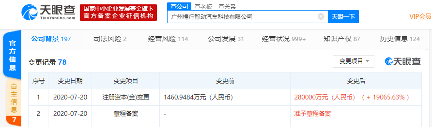 7月23日消息,天眼查数据显示,广州橙行智动汽车科技有限公司于日前发生工商变更,注册资本由原来的约1460.9万元人民币增至28亿元人民币,增幅约19065.6%。