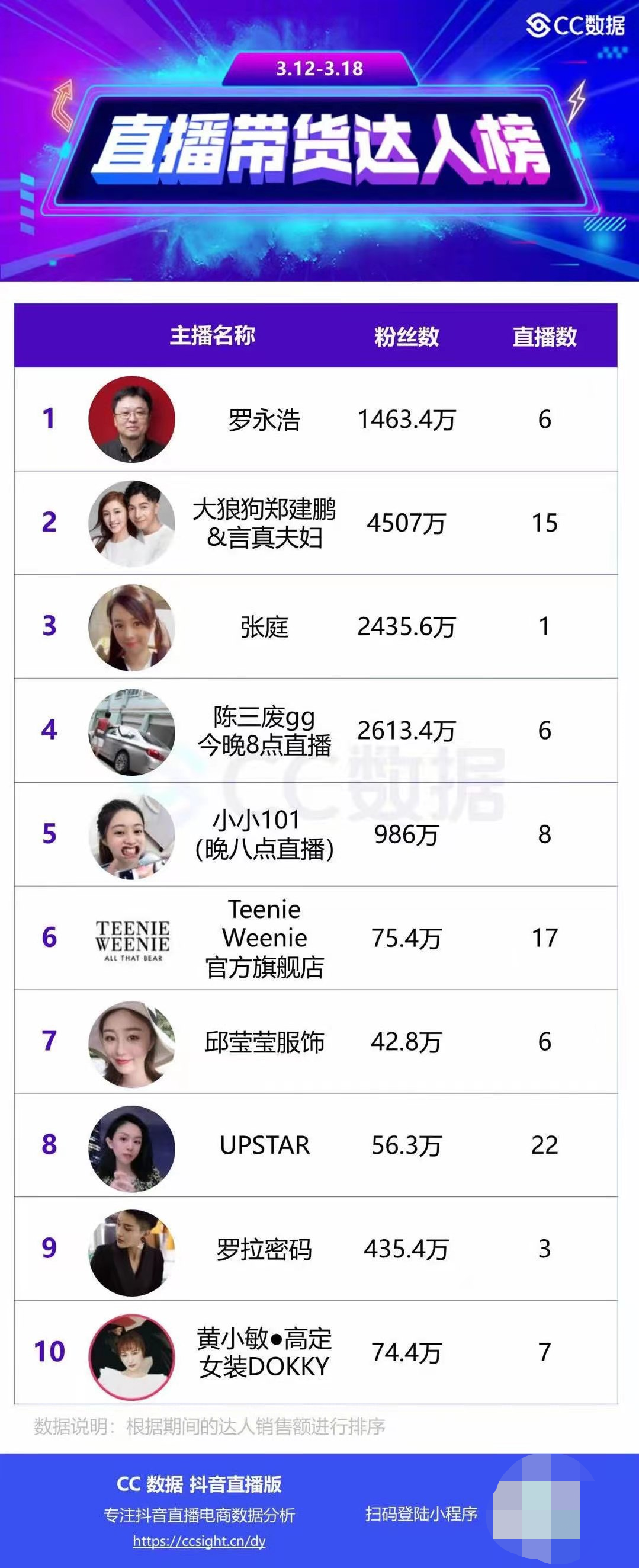 3月23日消息,CC数据公布了自3月12日至3月18日的抖音直播带货达人榜,榜单显示,拥有1463.4万粉丝的罗永浩凭6场直播拿下冠军,拥有4507万粉丝的大狼狗郑建鹏&言真夫妇位列第二,期间共直播15场;此外,张庭仅凭1场直播位列第三,目前粉丝数为2435.6万。