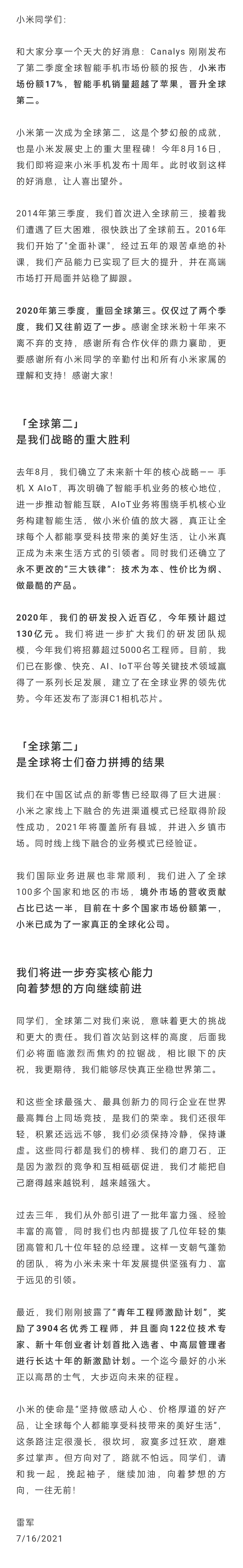 7月16日消息,今天凌晨Canalys发布了第二季度全球智能手机市场份额的报告,小米市场份额17%,智能手机销量超越了苹果,晋升全球第二。小米科技创始人、董事长雷军发布全员信,对员工以及合作伙伴致谢,并在信中提到小米刚刚披露的“青年工程师激励计划”。