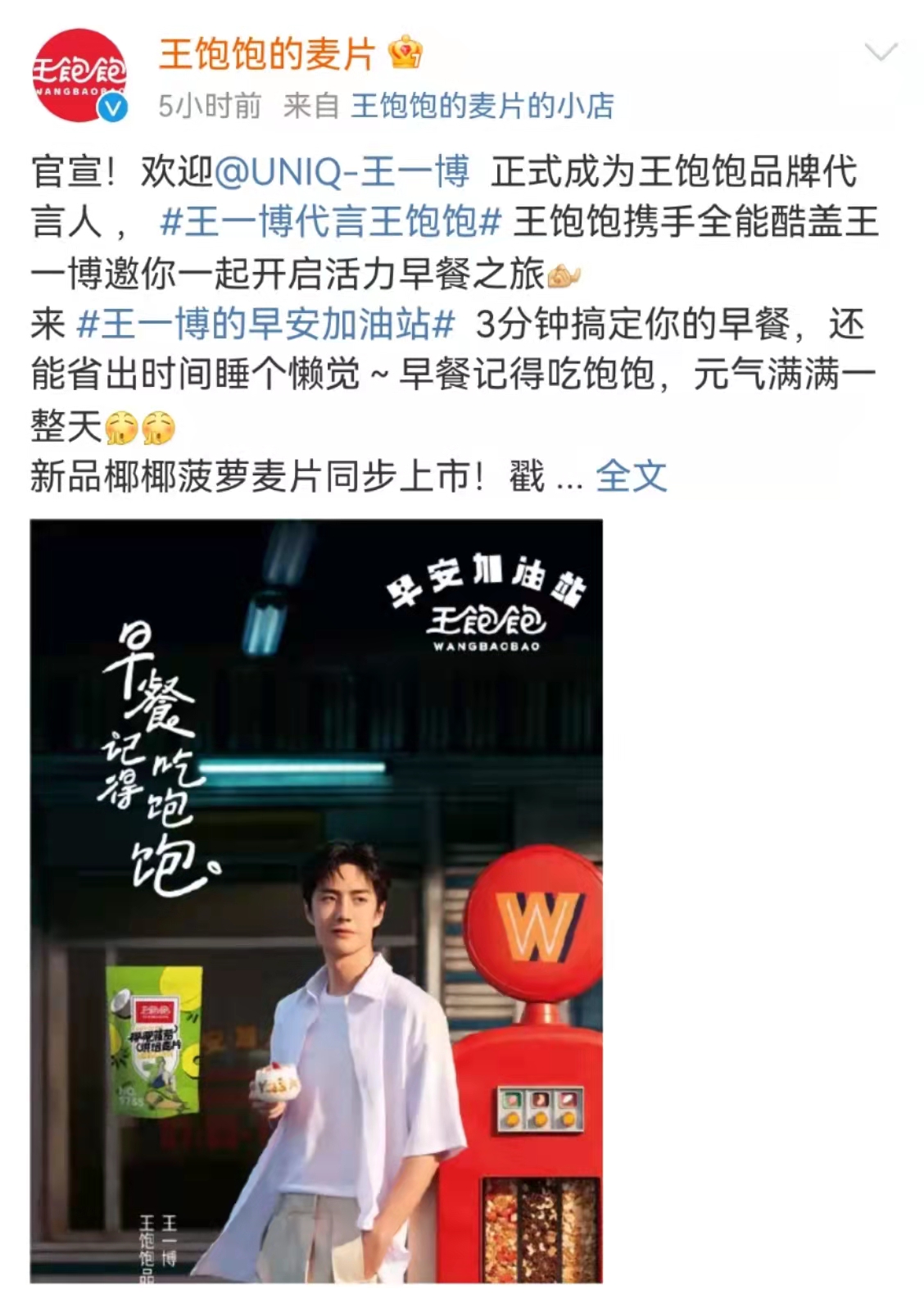 9月7日消息,“王饱饱”官方微博宣布,王一博成为王饱饱品牌代言人,并同时发售包含“王一博人形立牌”的AB双版早安礼盒。据悉,王饱饱是一个健康食品品牌,旗下主要涵盖酸奶果然多烘焙麦片、草莓优脆乳烘焙麦片、蜜桃乌龙烤燕麦等产品,作为天猫麦片类目的新消费领军品牌,目前已完成C轮融资。