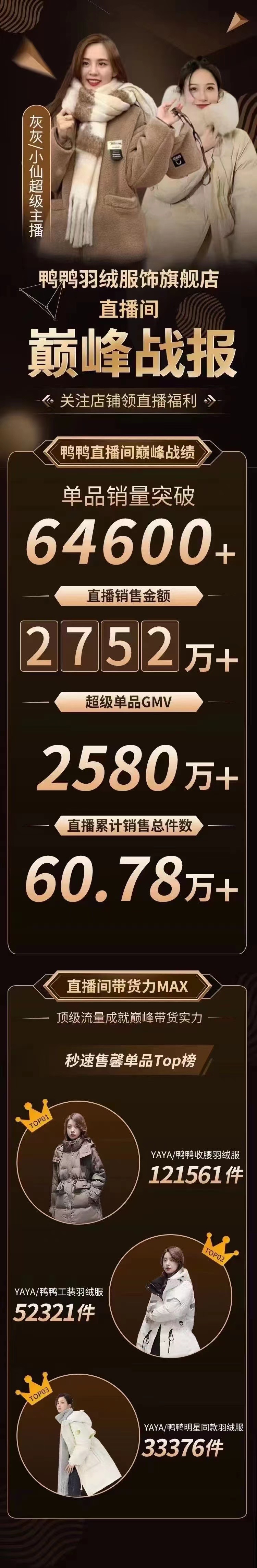 11月8日消息,截至当晚11点,鸭鸭羽绒服饰旗舰店直播间单品销量突破64600件,直播销售金额超2752万元,单品GMV超2580万,直播累计销量总件数超60.78万件。