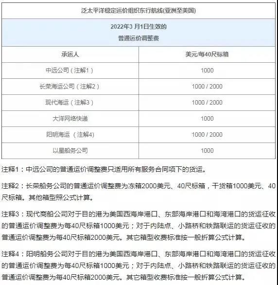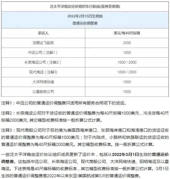2月14日消息,亚洲至美国航线的海运费有所调整,包括达飞、中远、长荣 、现代、以星等公司。据悉,海运费调整将由2月15日生效及3月1日生效。(外航运)